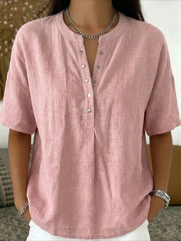 Cotton And Linen Round Neck Short Sleeve Button H-Line Daily Going Out Casual Loose Blouse