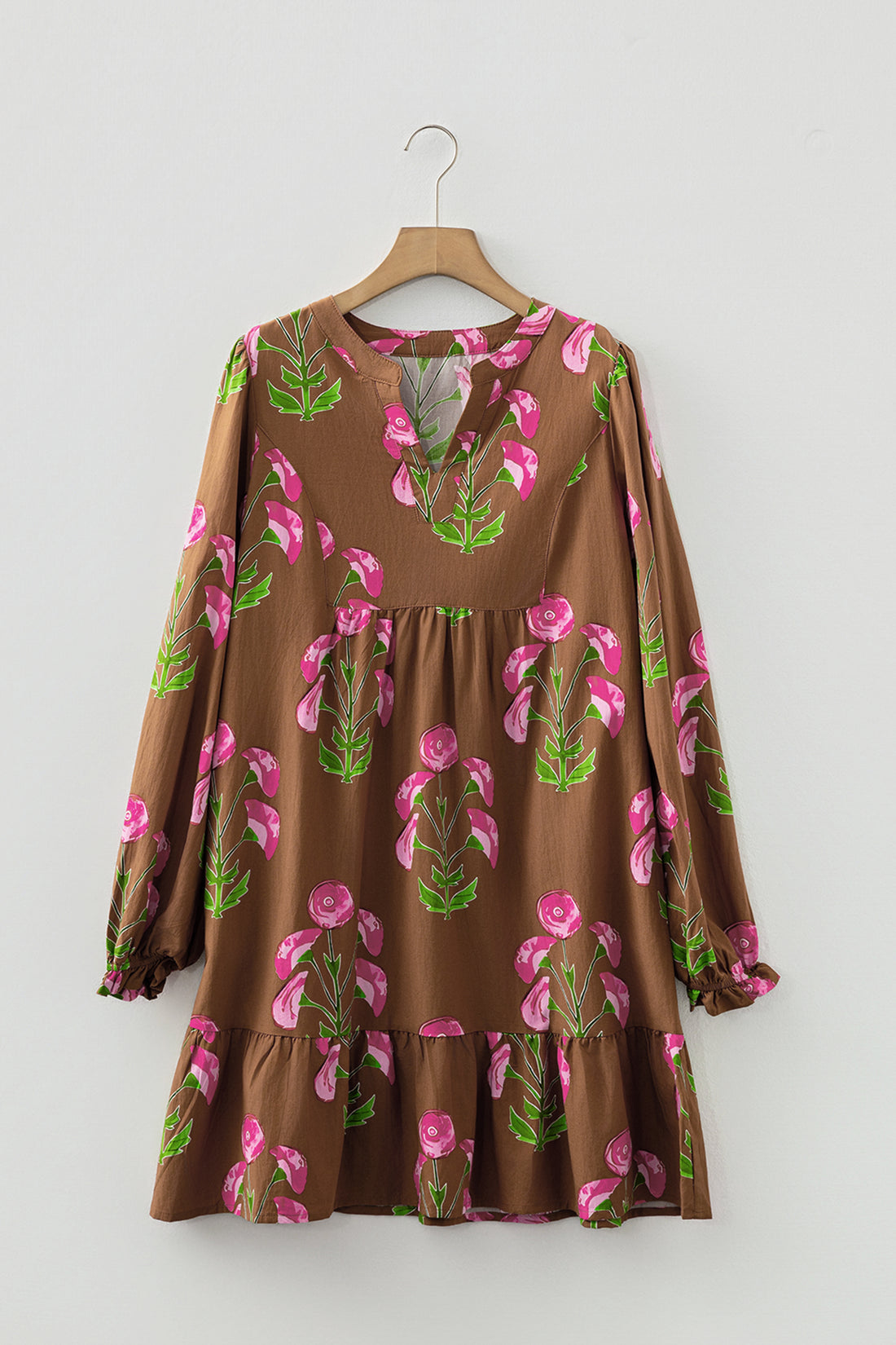 Brown Contrast Floral Print Babydoll Tunic Ruffled Hem Puff Sleeve Dress