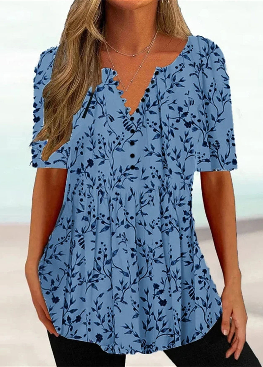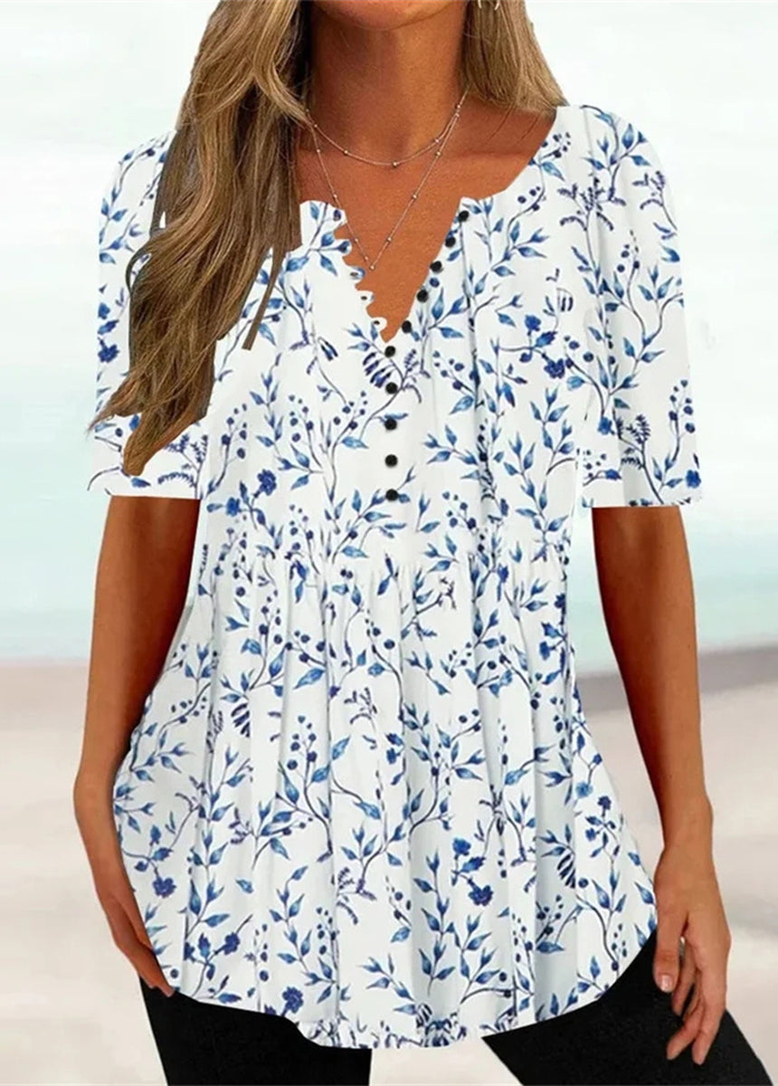 Sale Floral Printed V-neck Short Sleeve Pleated Button-Up T-Shirt