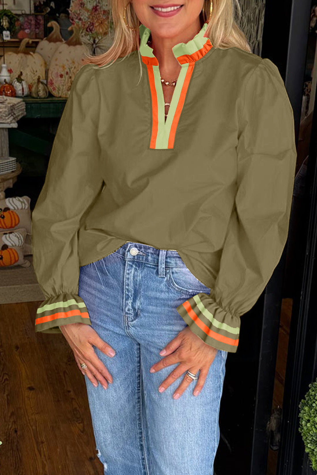 Four Leaf Clover Striped Trim Ruffle Split Neck Long Sleeve Blouse
