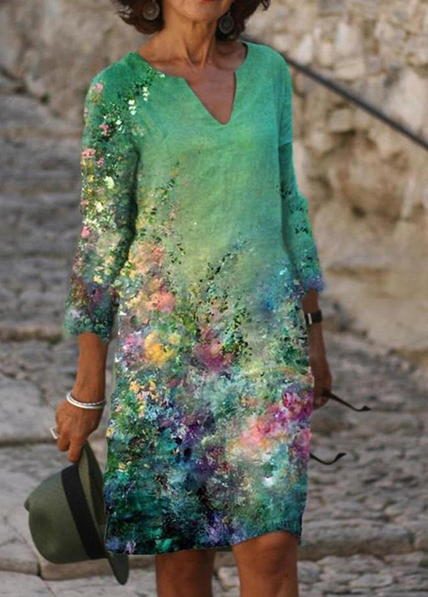 Green Floral Friled V Neck Puff Sleeve Ruffled Shirt Dress