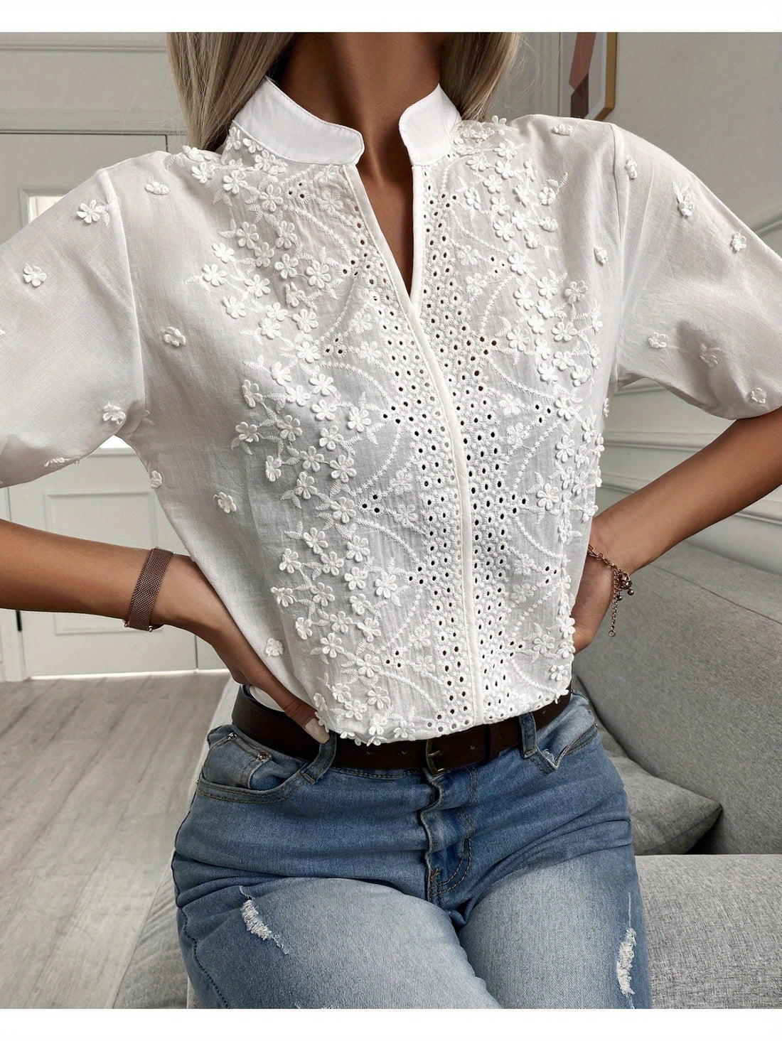 Sale V-Neck Stand-Up Collar, Hollowed Out Breathable Design Five-Quarter Sleeve 3D Embroidered Lace Top Shirt