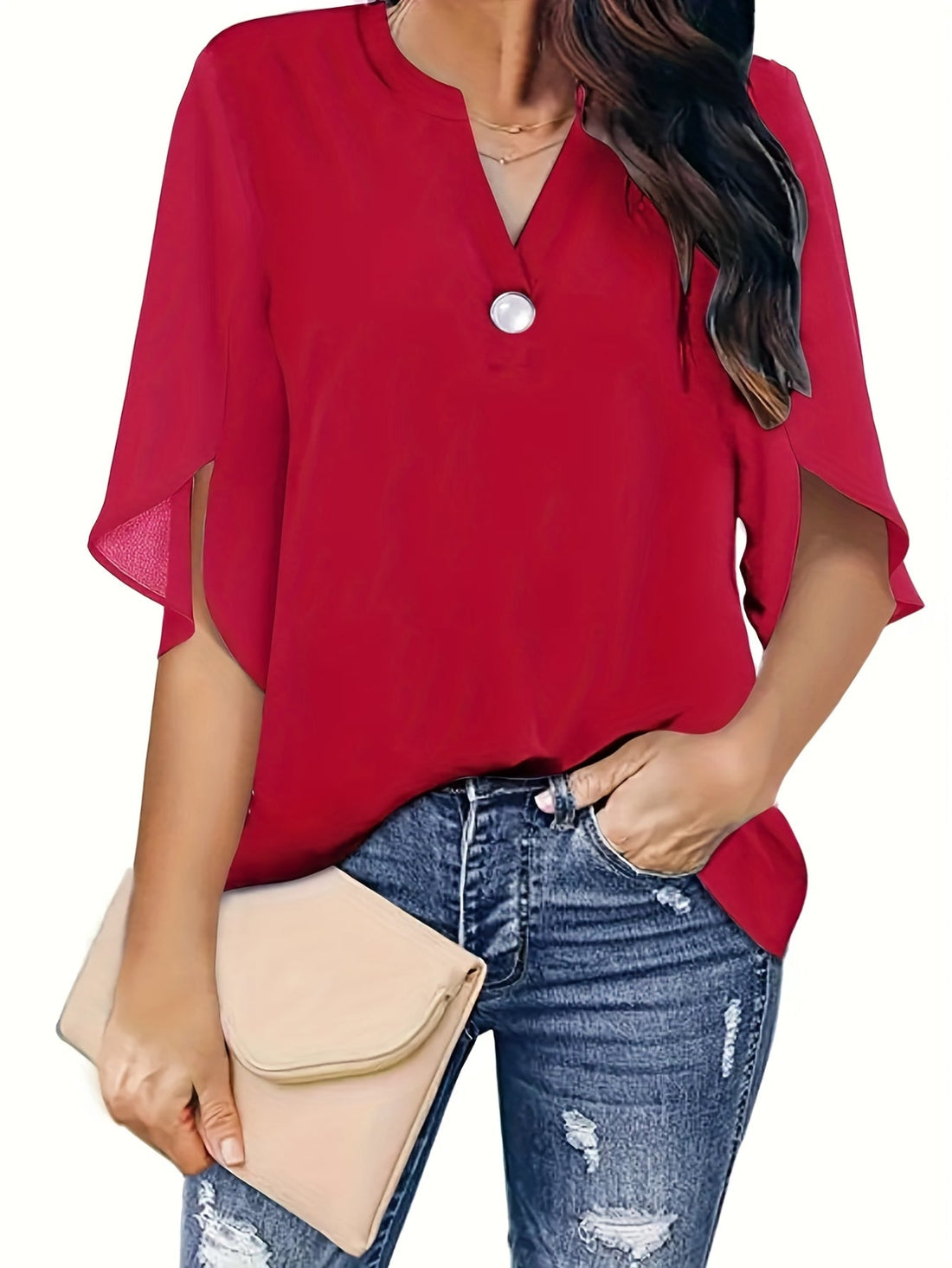 Sale Elegant Top, Women's Plain Button Decor Half Sleeve V Neck Slight Stretch T-shirt