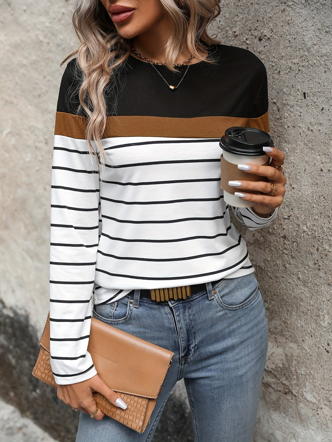 Sale Women's Striped Color Block T-Shirt - Casual Long Sleeve Top