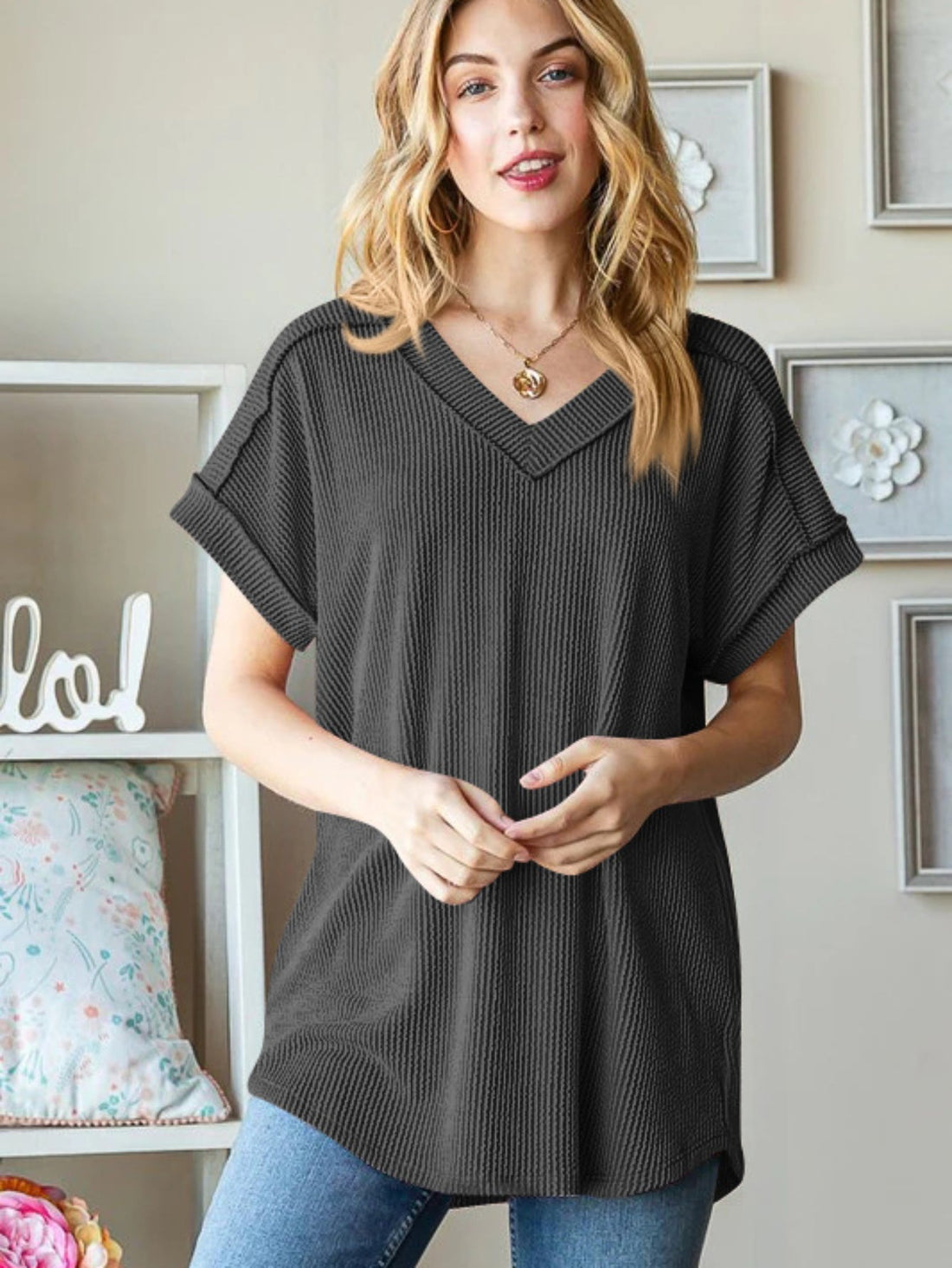 Women's Fashion Oversized Short Sleeve Solid Color V-Neck Button T-Shirt