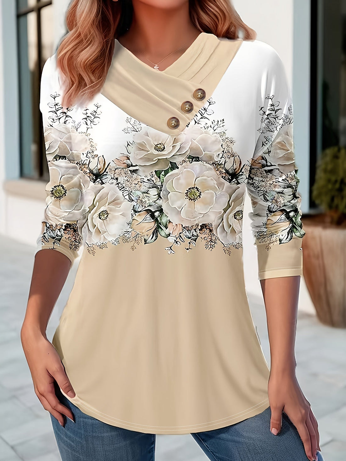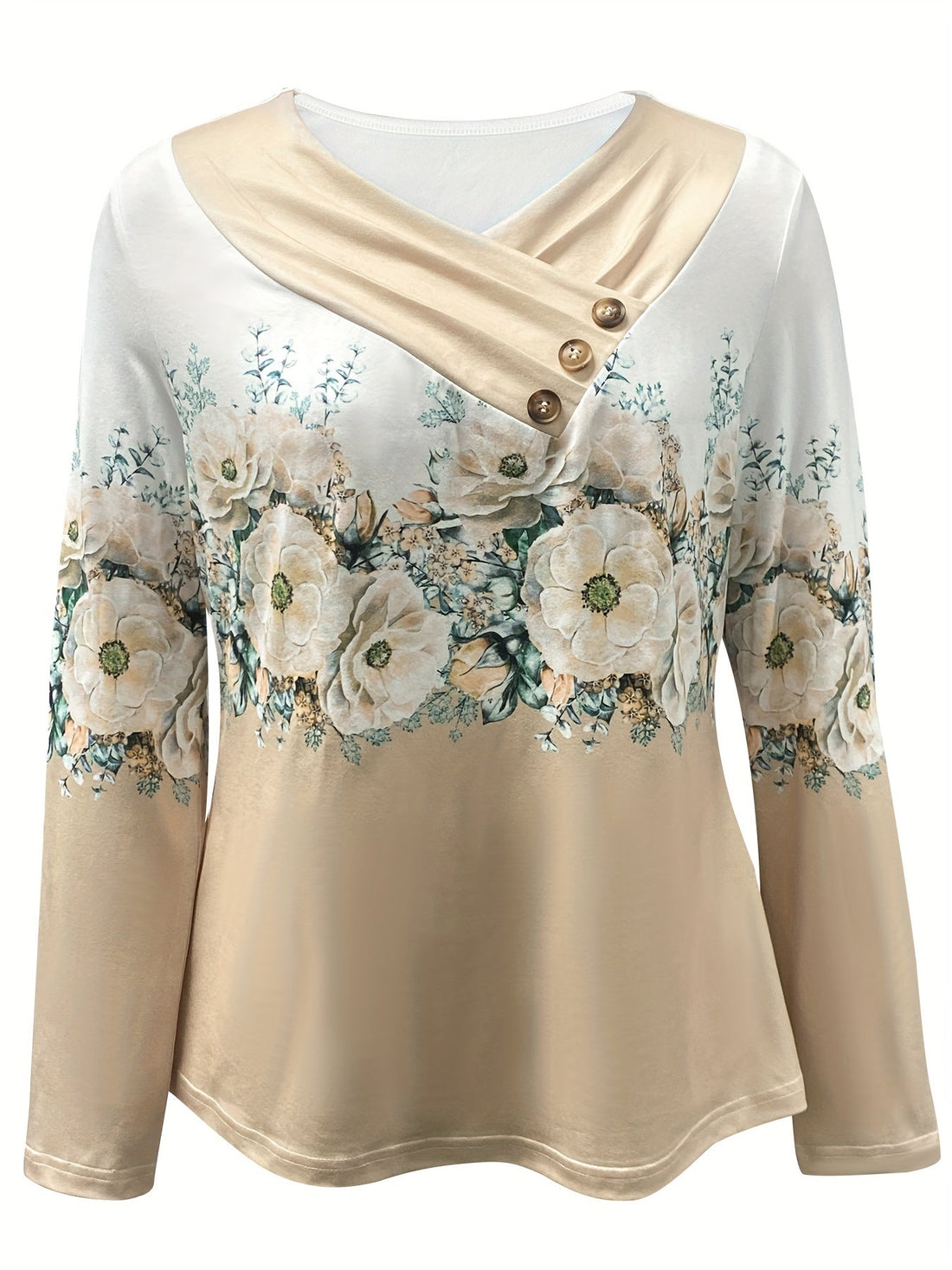 Sale Floral Print Surplice Neck Button T-Shirt, Casual Long Sleeve T-Shirt