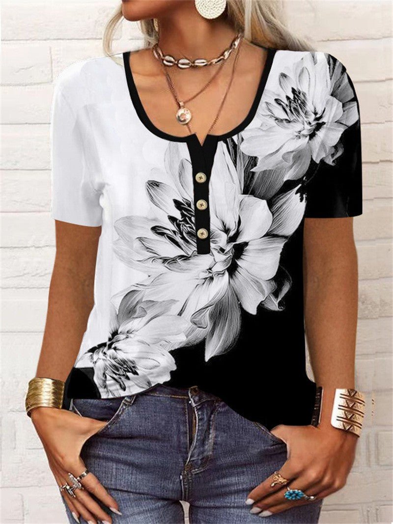 Sale V-neck Button Printed Short-sleeved T-shirt