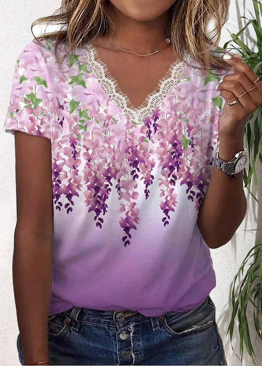 Sale Printed V-neck Lace Hem Short Sleeve T-shirt