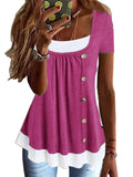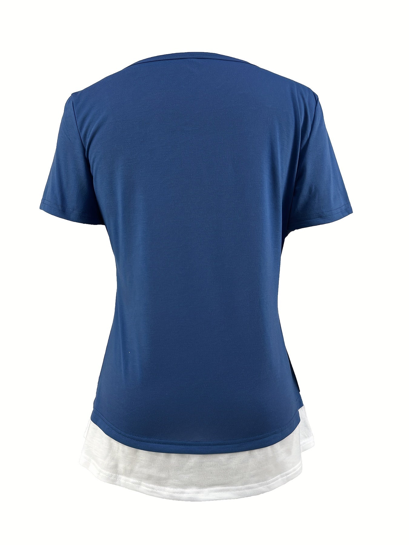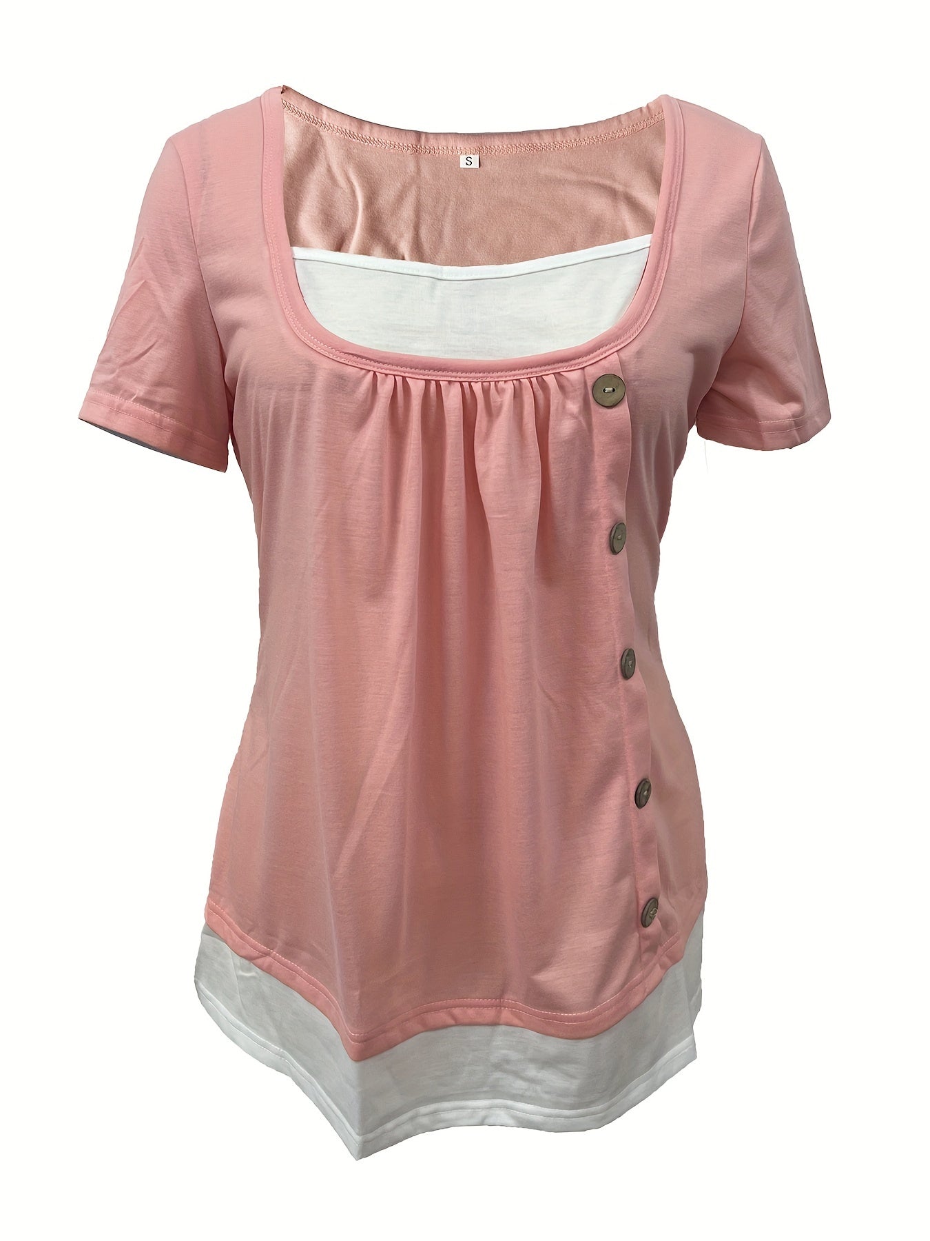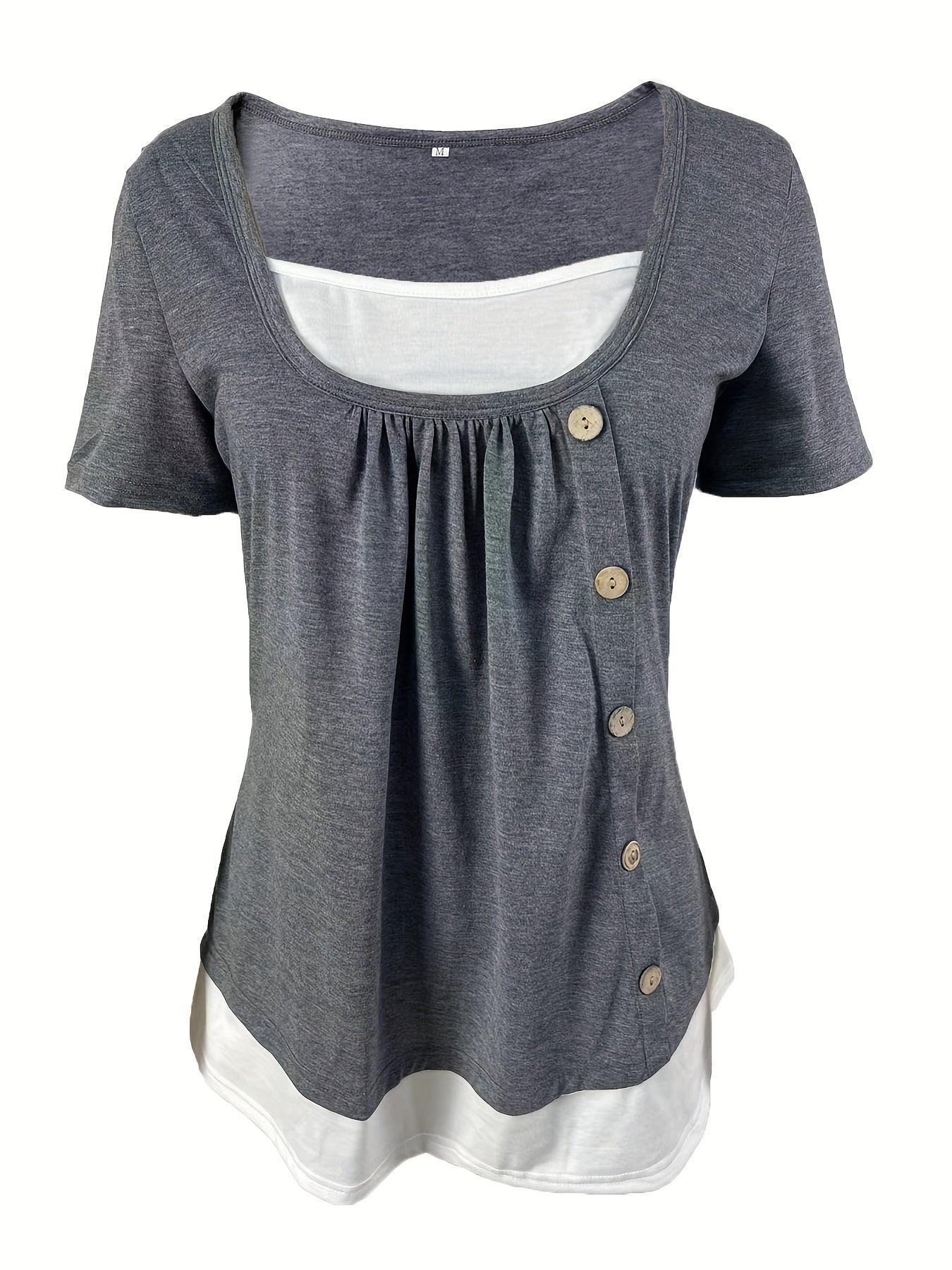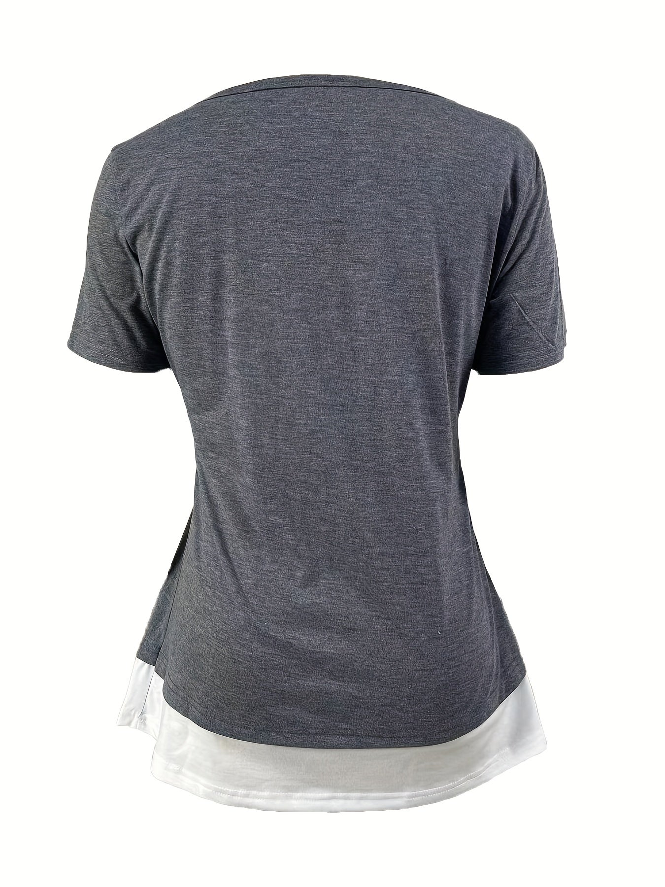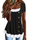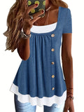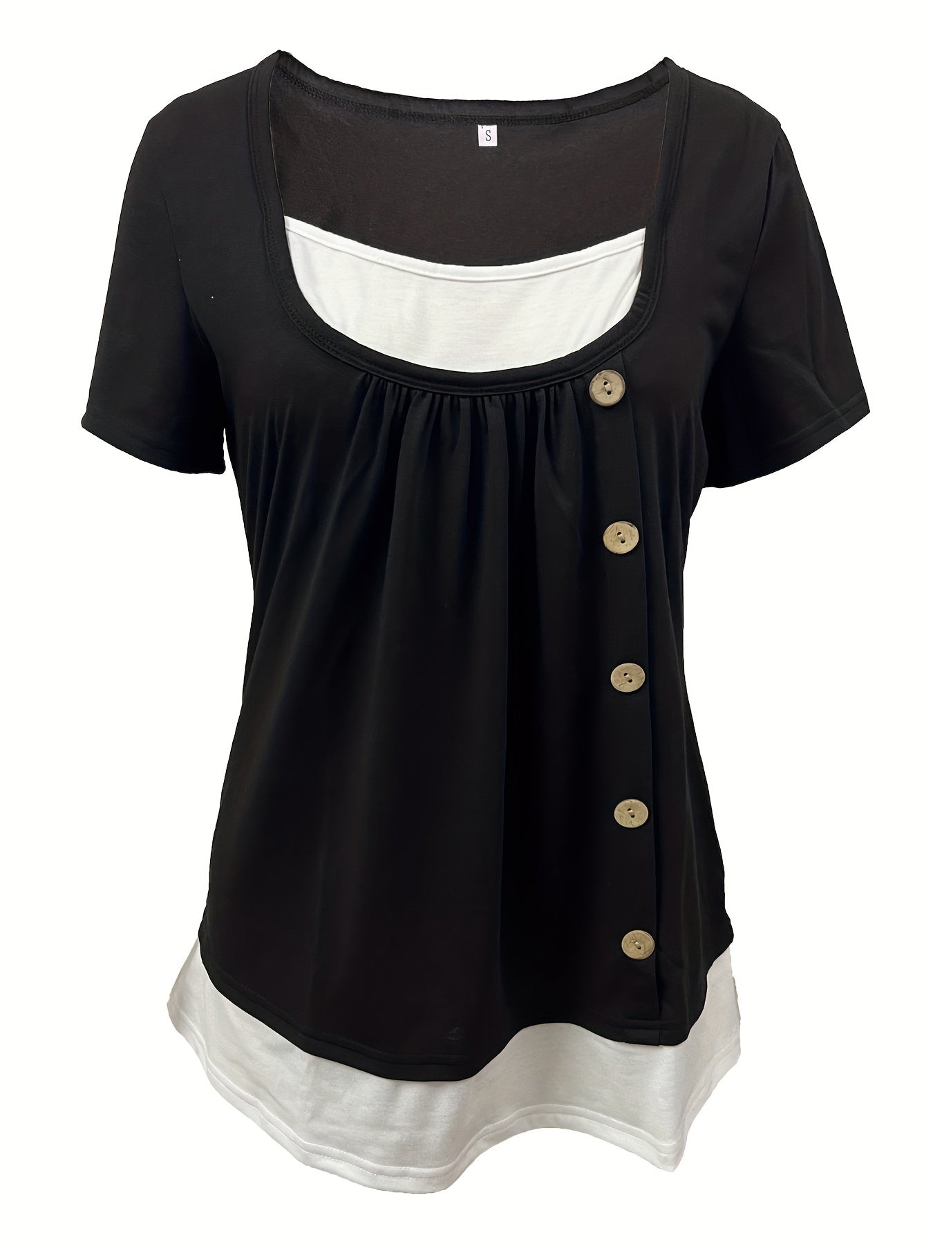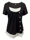 2 In 1 Color Block Button Front T-shirt, Casual Short Sleeve T-Shirt