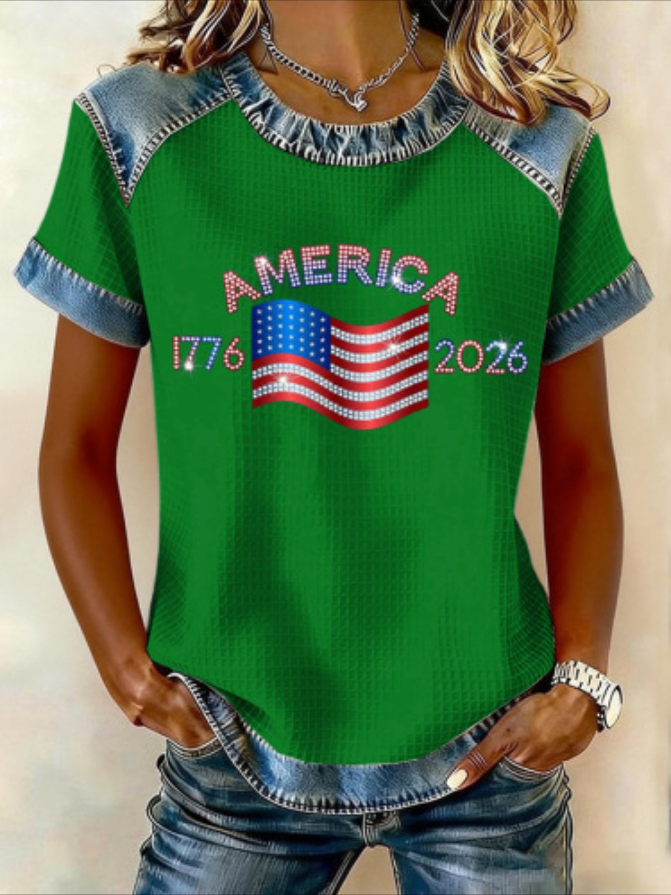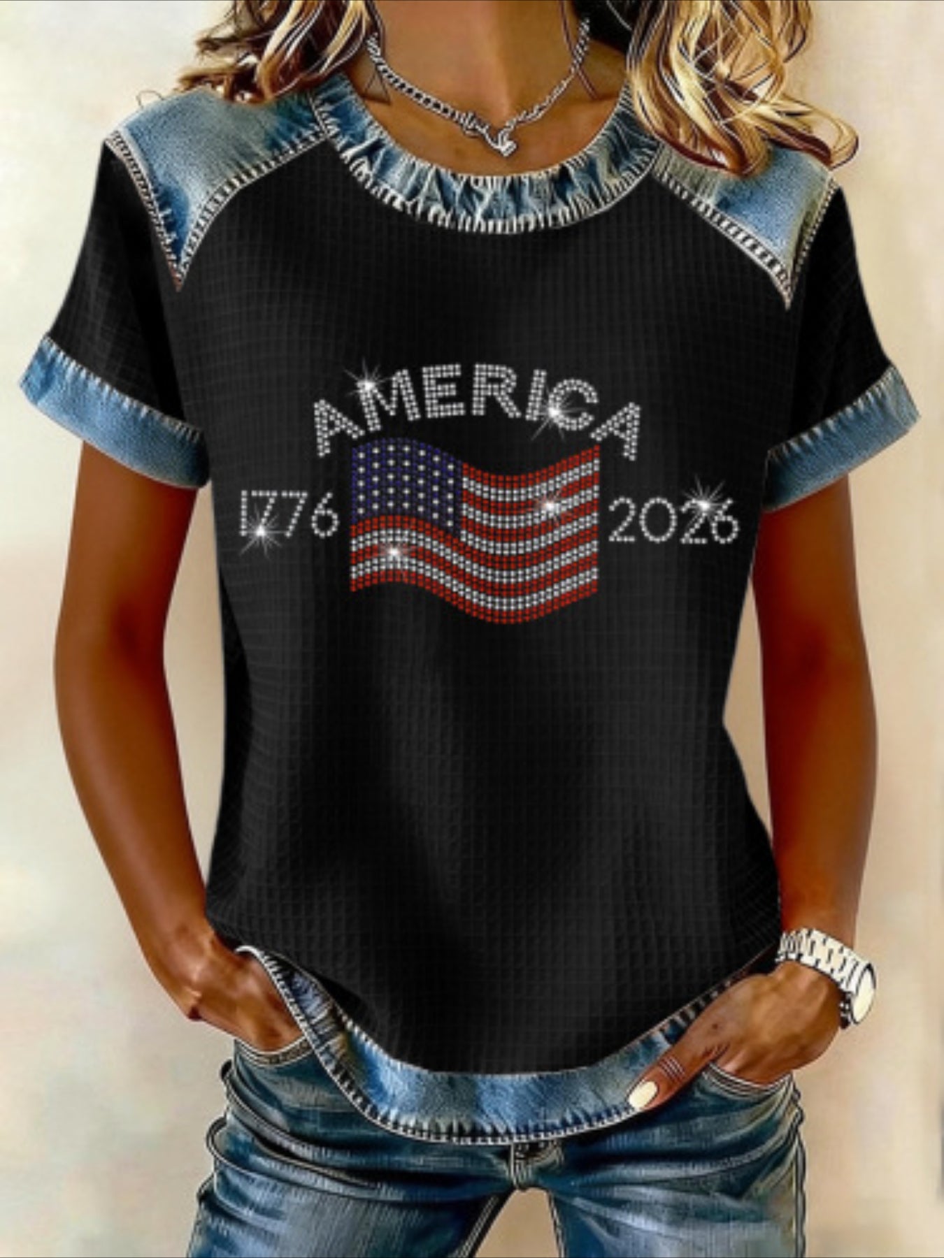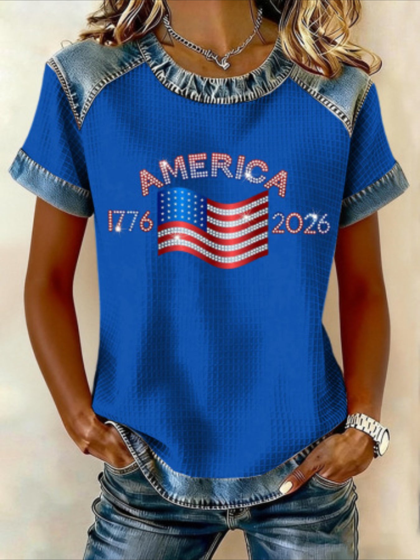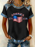 250th Anniversary Of The Founding Of the United States Short Sleeve Text Letters Printing Jersey Crew Neck T-shirt