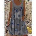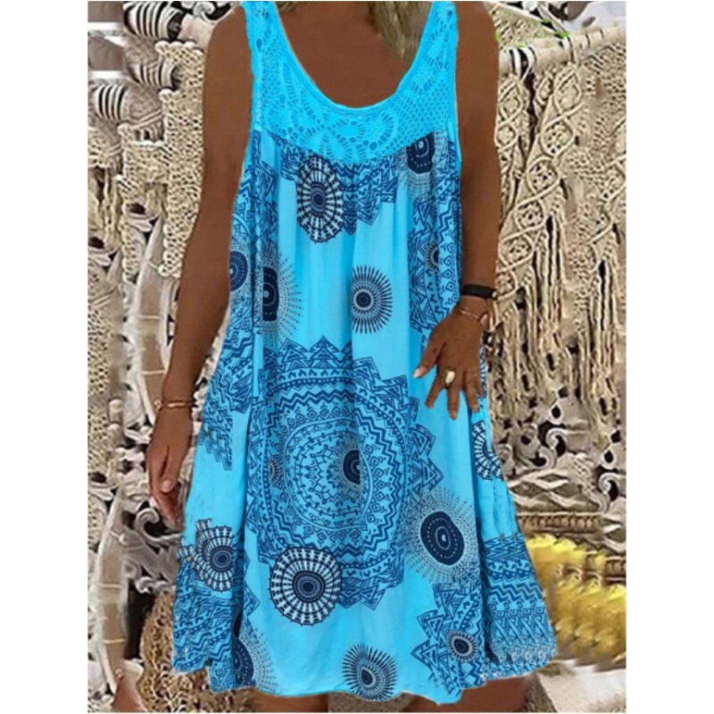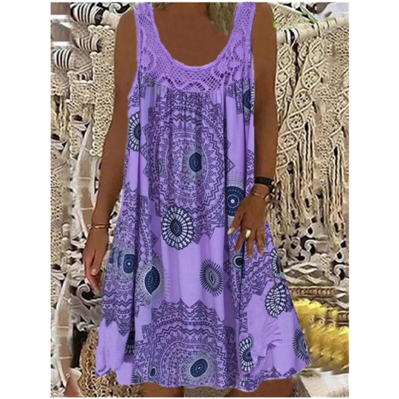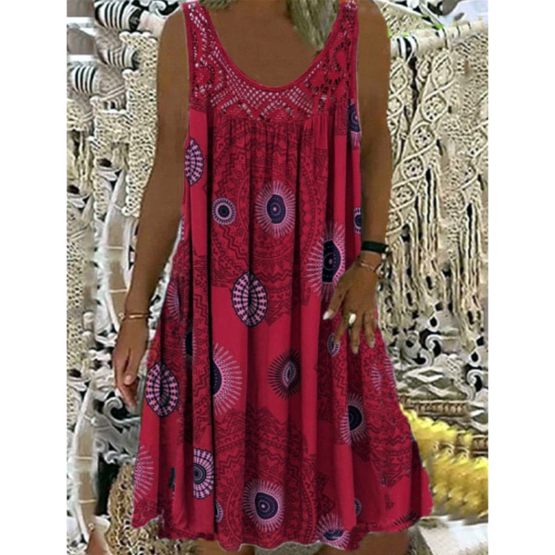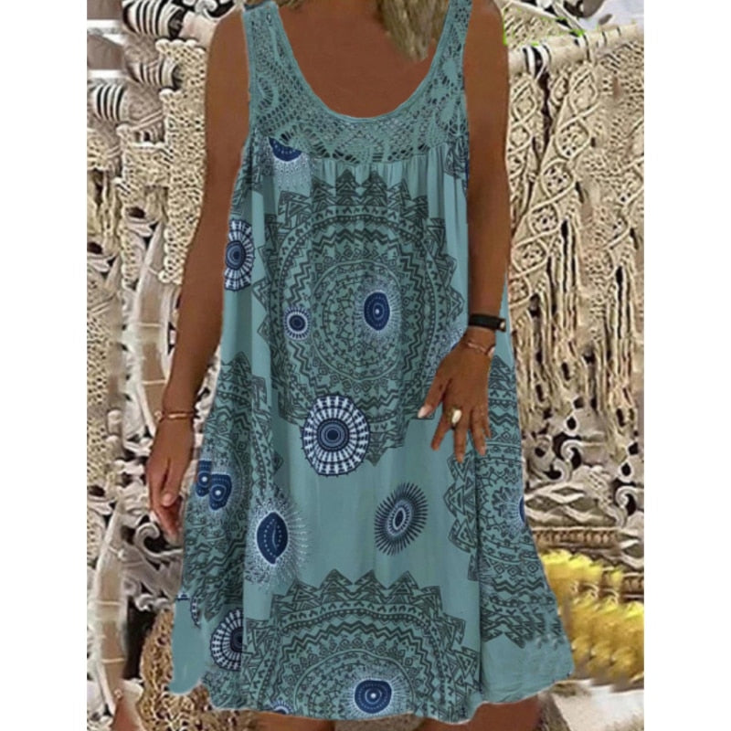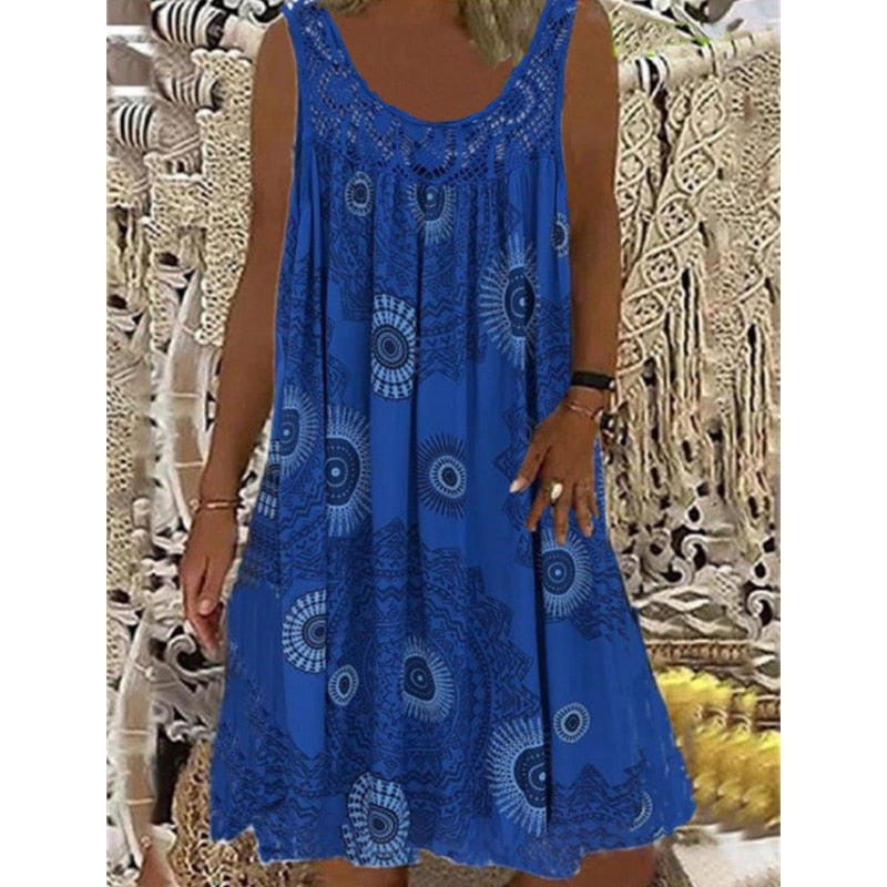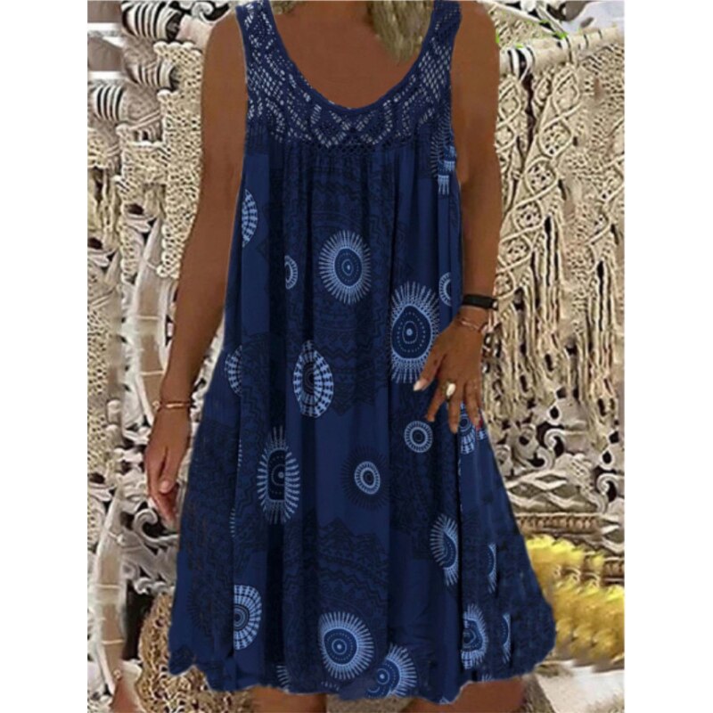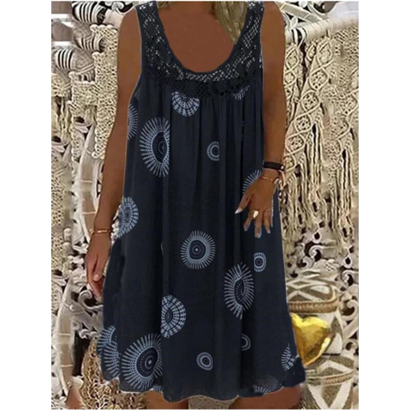 Sale A-Line Vintage Print Loose Pullover Round Neck Casual Lace Panel Midi Dress