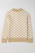 Apricot Checkered Buttons Collar V Neck Drop Shoulder Sweater