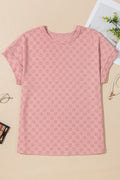 - Stay stylish with this pink womens t shirt.Crafted with a unique checkered texture for a modern look.Classic round neckline for a versatile and timeless appeal.Made with high-quality, breathable fabric for all-day comfort.