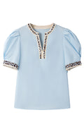 Sale Beau Blue Contrast Leopard Trim Split Neck Puff Sleeve Blouse