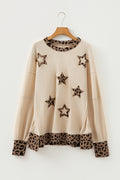 Beige Contrast Leopard Star Patchwork Detail Raw Seam Baggy Sweatshirt