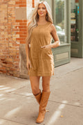 Beige Corduroy Sleeveless Mini Dress With Patched Pockets