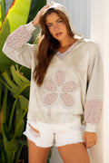 Beige Floral Patched Waffle Textured Colorblock V Neck Casual Hooded Top