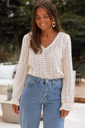 Sale Beige Flower Lace V Neck Ruffled Sleeve Top