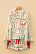 Beige Nutcracker Print Contrast Trim Tied up Bow Silky 2pcs Pajama Set
