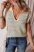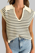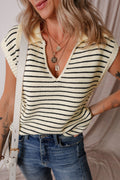 Beige Stripe Turn-down V Neck Sweater Tank Top