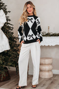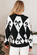 Black Bow Print 2-tone Rhombus Knit Loose Sweater
