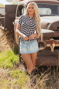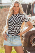 - This slim tee is fashionable with checkered pattern.It features a flattering fit style with a crew neck.It’s sleek, lightweight and comfy with mesh made.Pairs well with any chic bottoms for women.