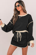Black Color Contrast Loose Pullover and Lace-up Waist Skort Set