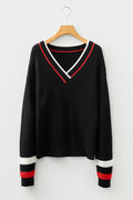 Black Contrast Striped Trim V Neck Drop Shoulder Sweater