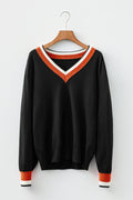 Black Contrast Striped Trim V Neck Varsity Sweater