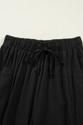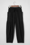 Black Drawstring Elastic Waist Patch Pocket Barrel Leg Casual Pants