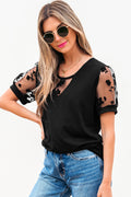 - The printed mesh adds a chic and flirty charm.Black t shirt with mesh puff sleeve is flattering and elegant.This ladies’ top pairs well with jeans and skirts.Different patterns and sizes are available.