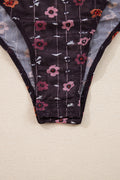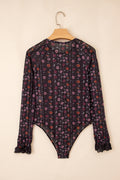 Sale Black Floral Print Smocked Cuff Slim Fit Mesh Bodysuit