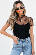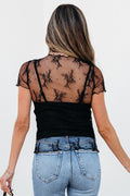 Sale Black Floral Sheer Mesh Short Sleeve Mock Neck Blouse