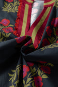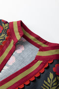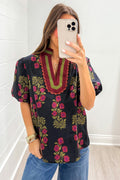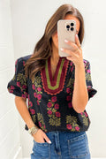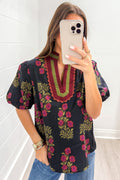 Black Floral Short Bubble Sleeve Contrast Slit Neckline Blouse