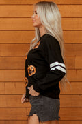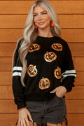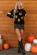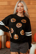 Black Halloween Pumpkin Face Sequin Patched Oversize Varsity Sweatshirt