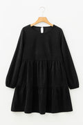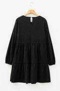 - This casual short dress is so cute and, better yet, functional.The swinging A-line tiered silhouette is perfect for any body shape.This long sleeve dress has a round neck and a button keyhole back.Style this dress with heels, boots, or sneakers for any occasion.