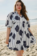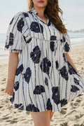 Black Plus Size Floral 3/4 Puff Sleeve Lace-up Neck Mini Dress