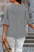 Black Plus Size Plaid Bow Decor Bell Sleeve Round Neck Jumper
