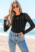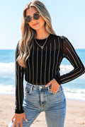 Sale Black Rhinestone Decor Striped Mesh Long Sleeve Bodysuit