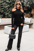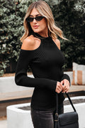 Black Ribbed Knit Cold Shoulder Choker Neck Sweater