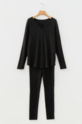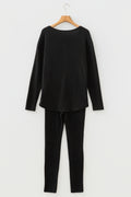 Black Ribbed Notched Neck Knit Long Sleeve Leggings Two Pieces Lounge Set