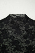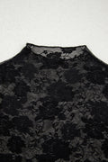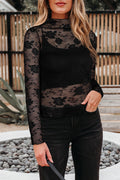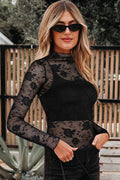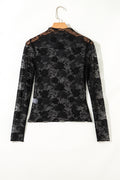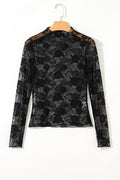 Sale Black Sheer Floral Lace Mesh Mock Neck Long Sleeve Top