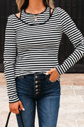 Sale Striped Botton Crew Neck T-Shirt, Elegant Long Sleeve T-Shirt