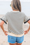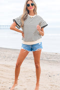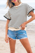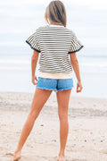 Black Stripe Scallop Lace Trim Ruffle Short Sleeves Crewneck Top