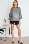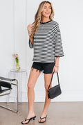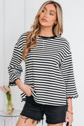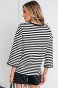 Black Striped Print Drop Shoulder Lace Trim Bracelet Sleeve Loose Top