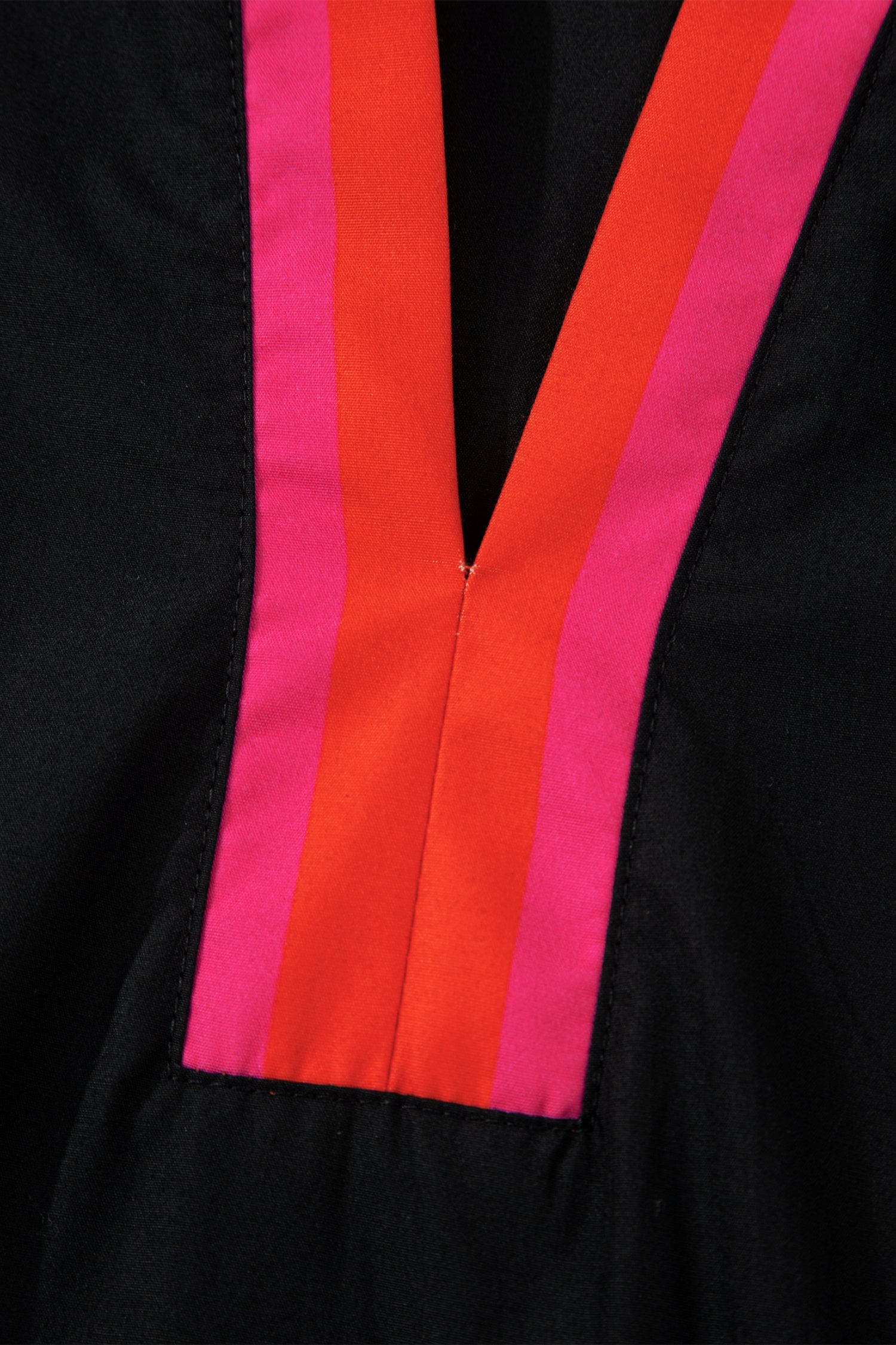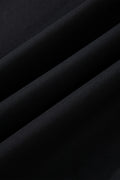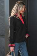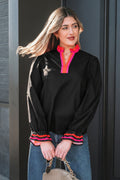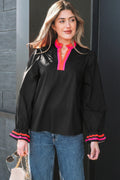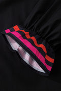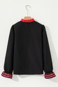 Black Striped Trim Ruffle Split Neck Long Sleeve Blouse
