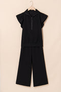 Black Textured Ruffled Sleeve Zipped Top and Wide Leg Pants Set