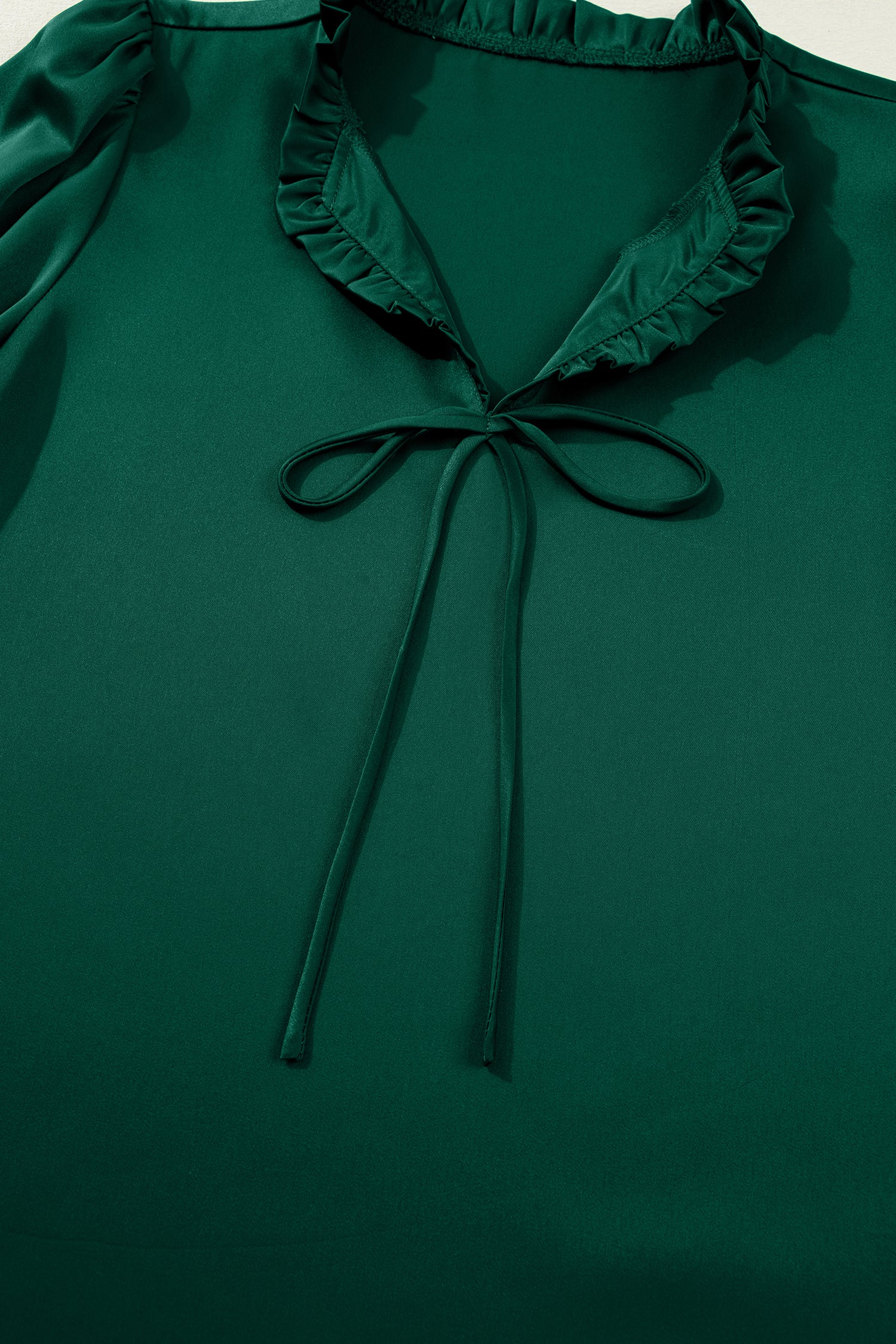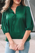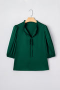 Blackish Green Solid Color Frilled V Neck Bow Detail 3/4 Sleeve Blouse