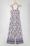 Sale Blue Boho Geometric Print Shirred High Waist Wide Leg Jumpsuit
