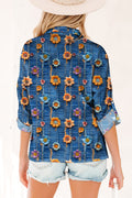 Blue Floral Collared V Neck Roll up Sleeve Shift Blouse